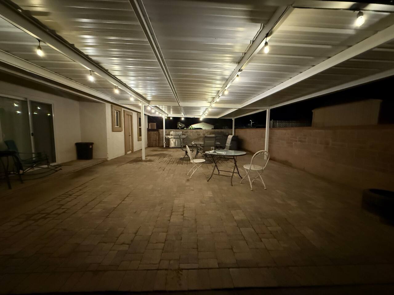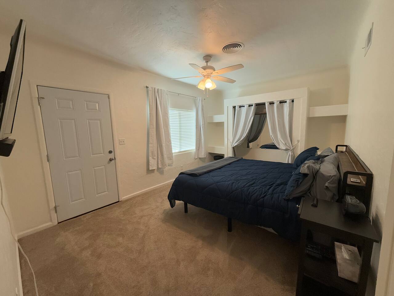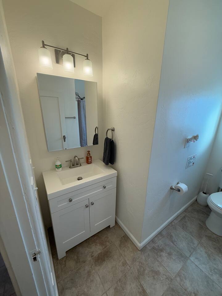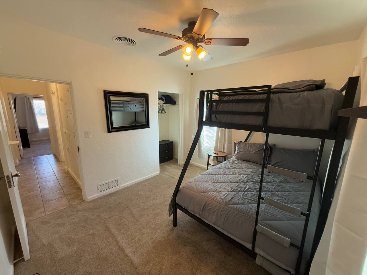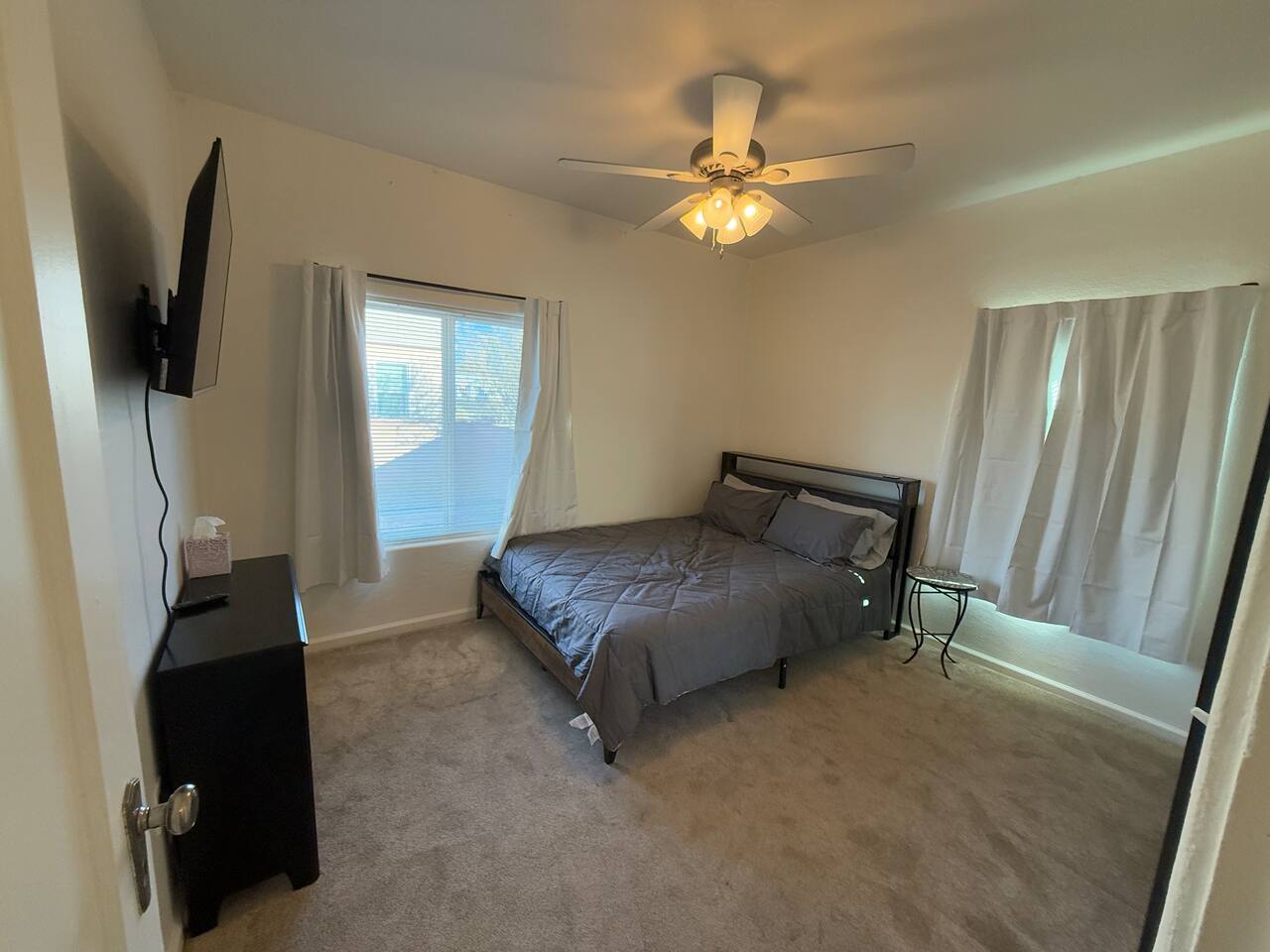 Spacious master bedroom with king size bed. Second bedroom has a comfortable queen. Third bedroom has a bunk bed with a full over twin. All bedrooms have smart TV’s. One couch to sleep on in the living room, and one in the den. There is also an air mattress in the hallway closet, as well as extra bedding and pillows. Den area has a full size pool table with lots of room, as well as boardgames. Backyard has a huge covered patio area with outdoor seating, a fire place, and a bbq grill. Plenty of street parking, as well as a two car covered carport.