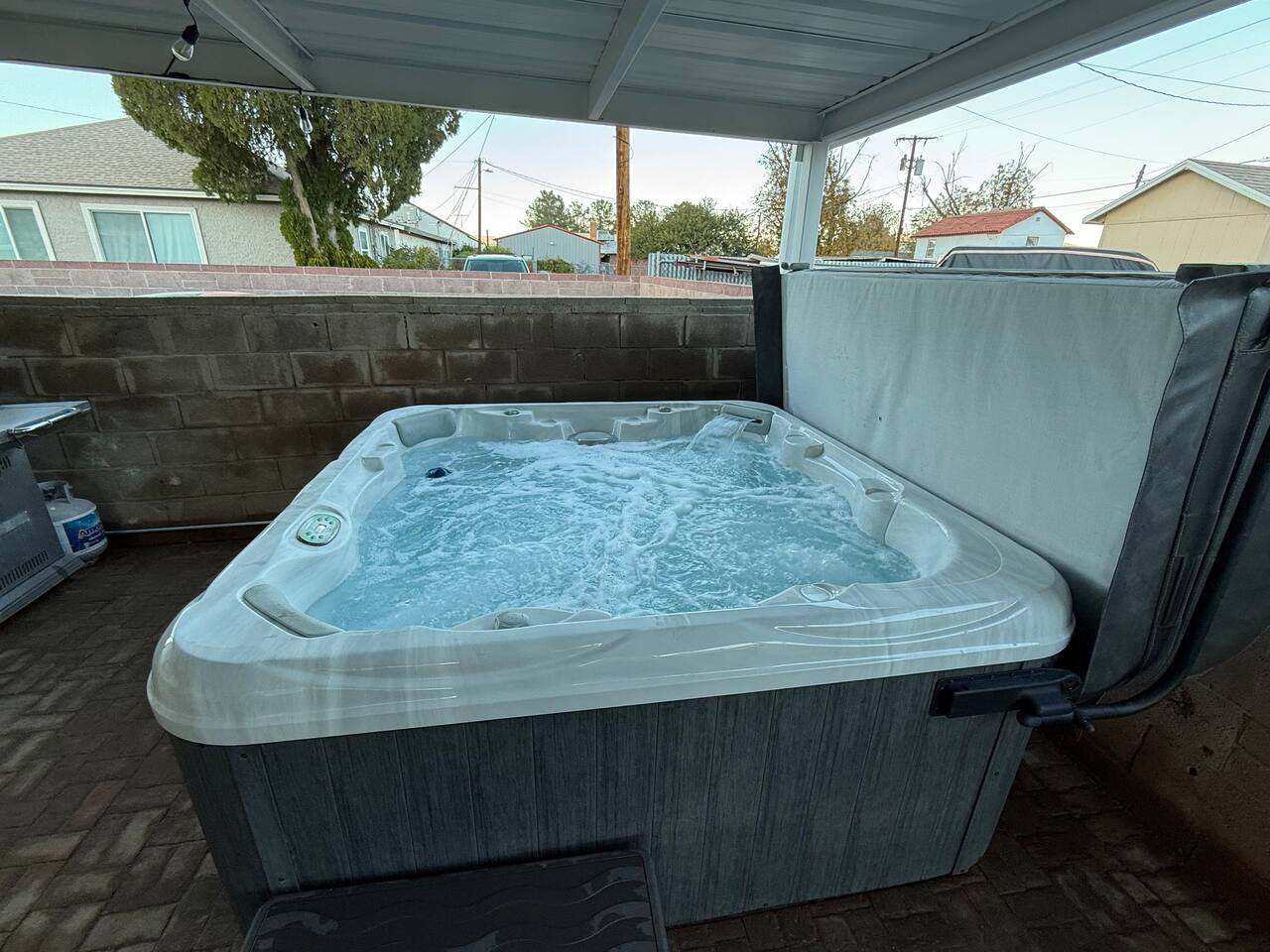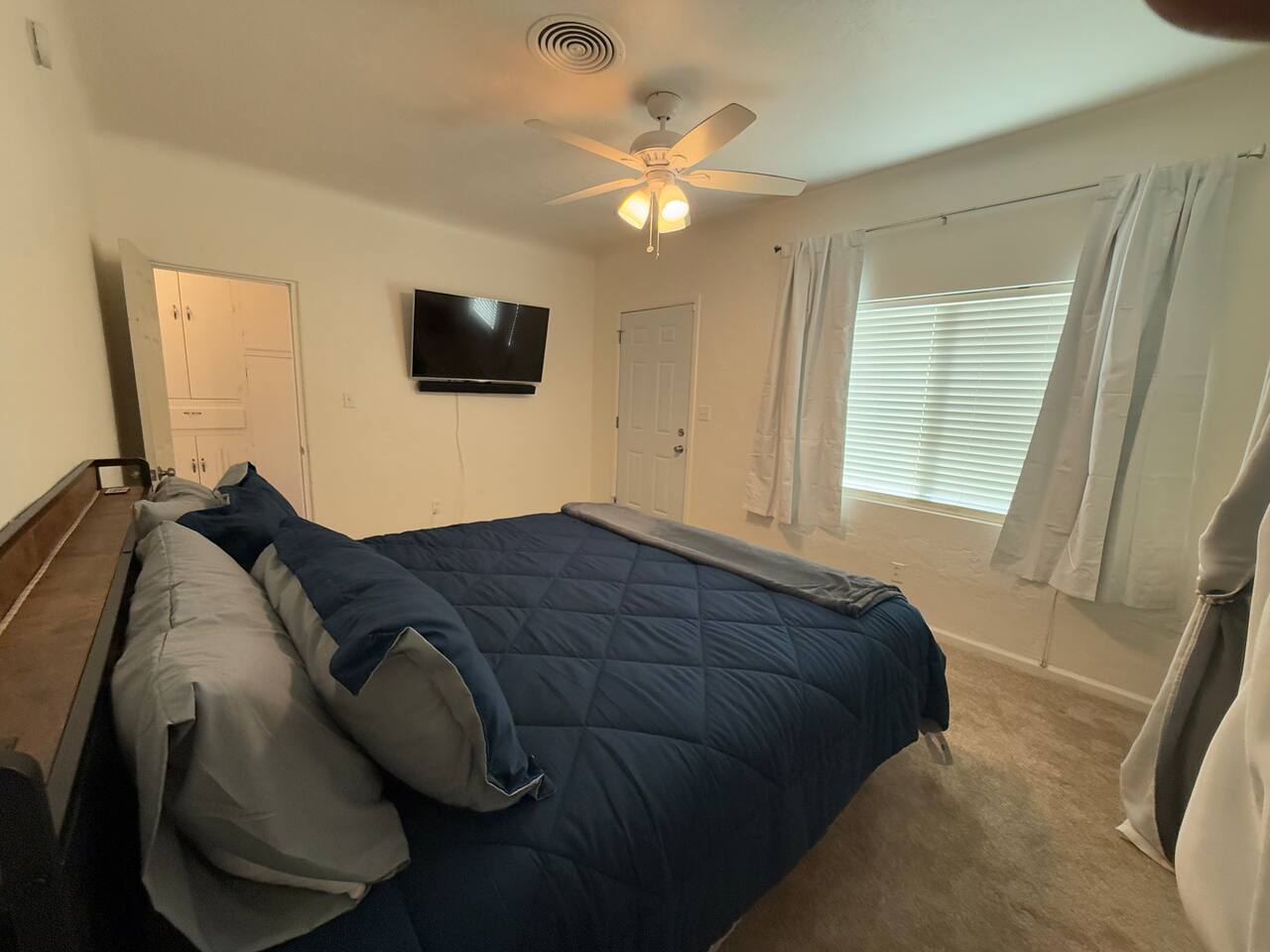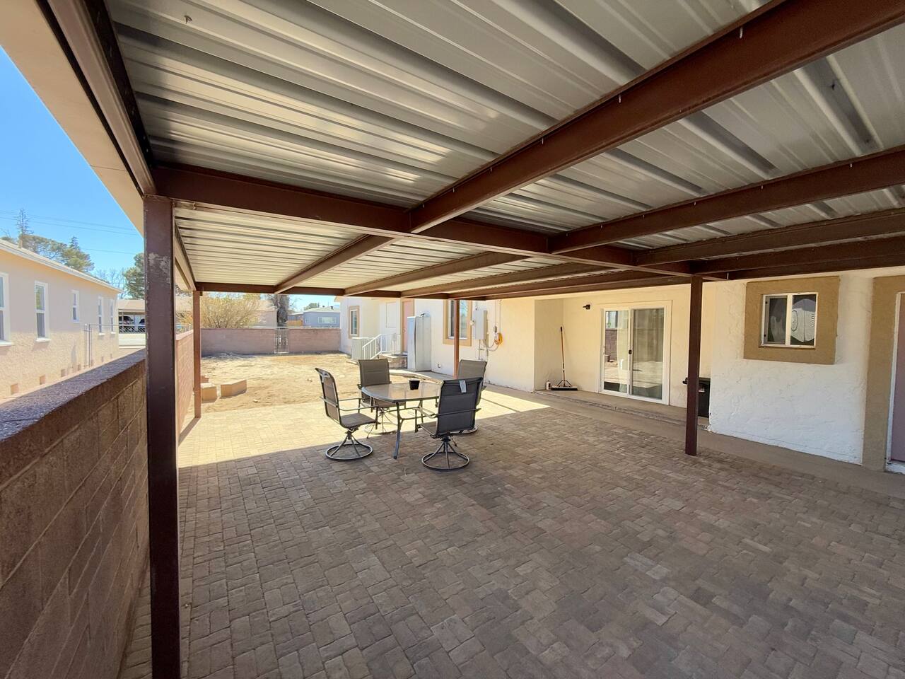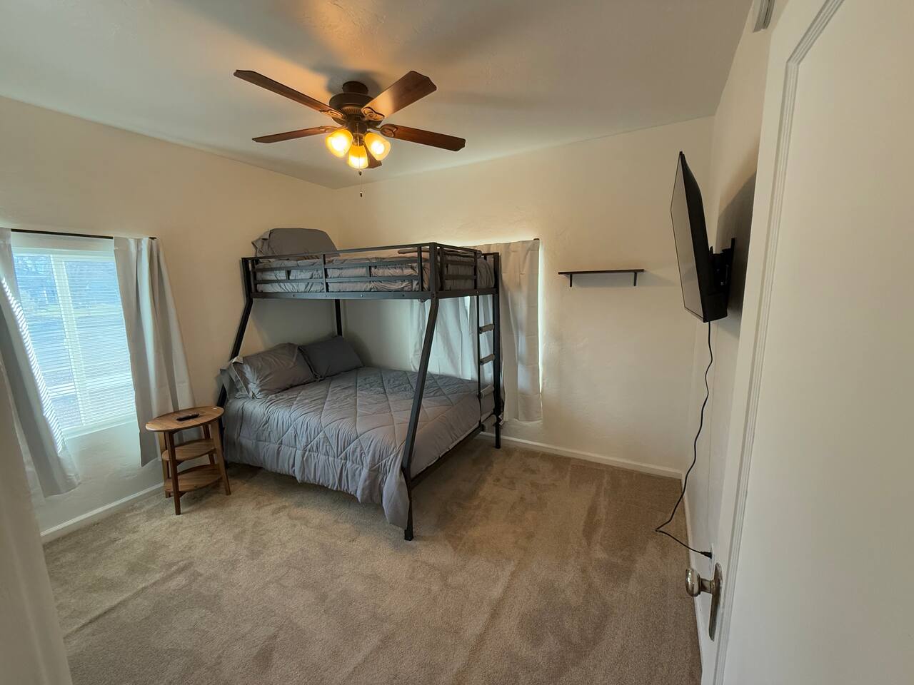 Spacious master bedroom with king size bed. Second bedroom has a comfortable queen. Third bedroom has a bunk bed with a full over twin. All bedrooms have smart TV’s. One couch to sleep on in the living room, and one in the den. There is also an air mattress in the hallway closet, as well as extra bedding and pillows. Den area has a full size pool table with lots of room, as well as boardgames. Backyard has a huge covered patio area with outdoor seating, a fire place, and a bbq grill. Plenty of street parking, as well as a two car covered carport.