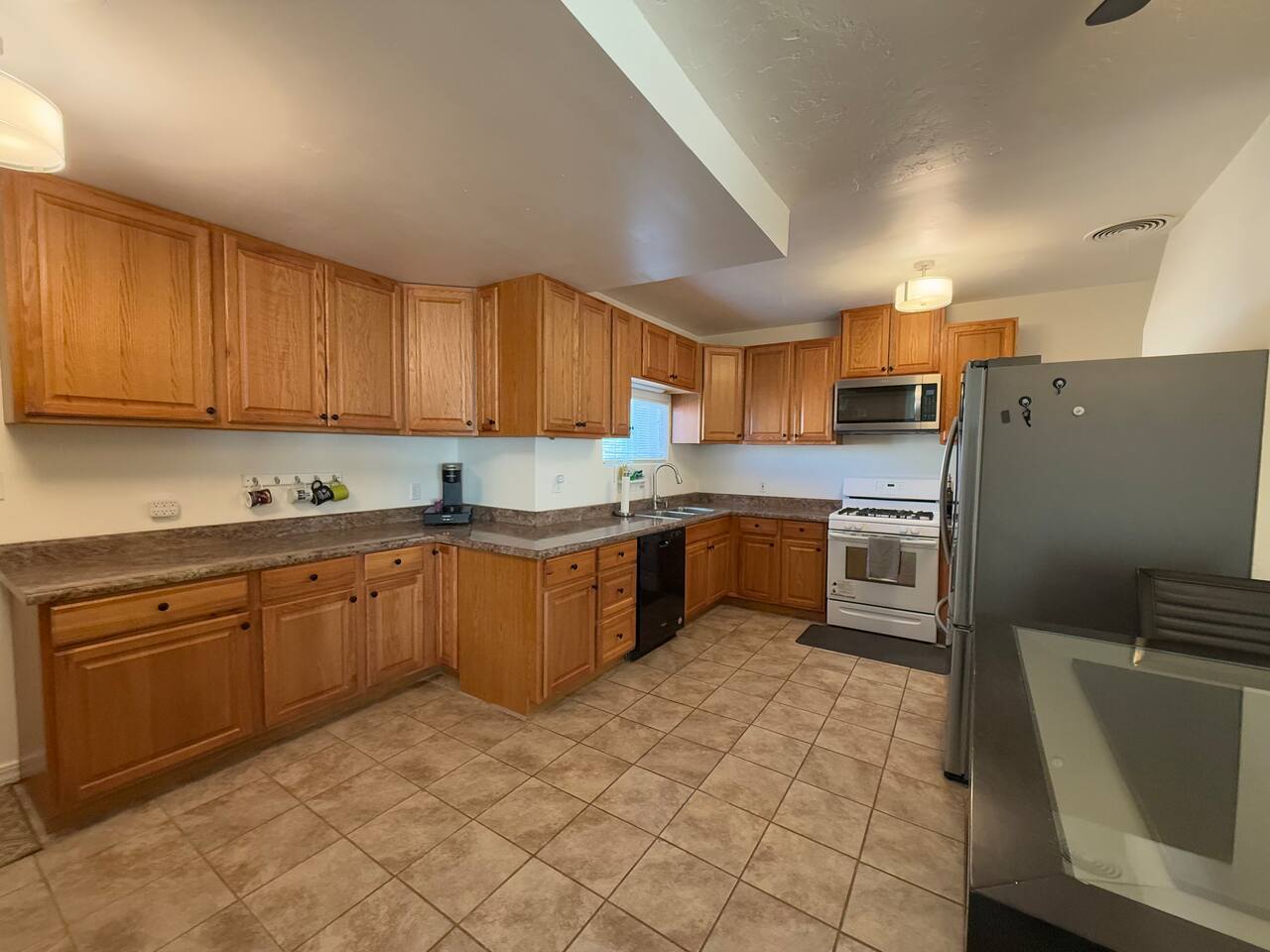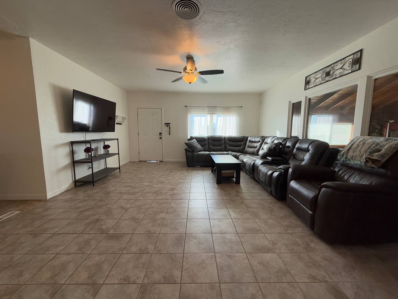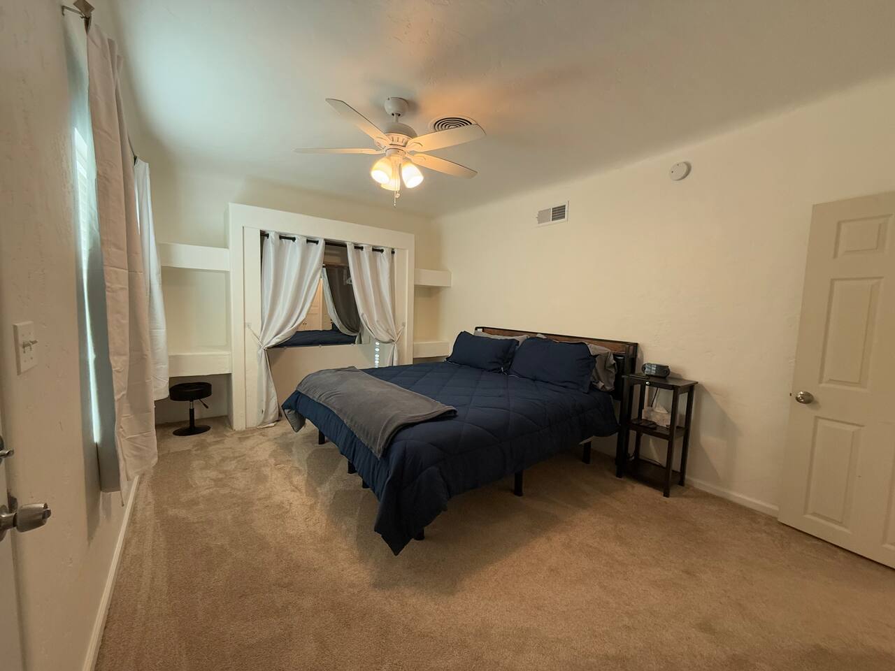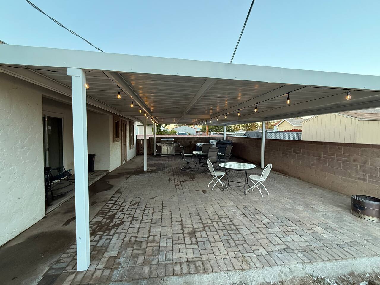 Spacious master bedroom with king size bed. Second bedroom has a comfortable queen. Third bedroom has a bunk bed with a full over twin. All bedrooms have smart TV’s. One couch to sleep on in the living room, and one in the den. There is also an air mattress in the hallway closet, as well as extra bedding and pillows. Den area has a full size pool table with lots of room, as well as boardgames. Backyard has a huge covered patio area with outdoor seating, a fire place, and a bbq grill. Plenty of street parking, as well as a two car covered carport.